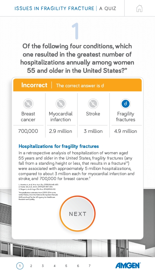 This multi-question interactive touch screen quiz was designed and developed for the Amgen booth at an international orthopedic conference.