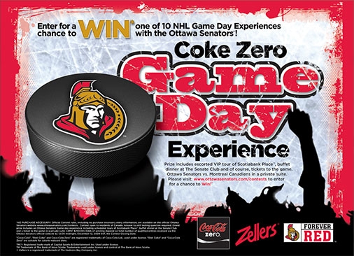 This is one of the many sweepstakes and POP promotional programs we have developed in conjunction with Meyers Promotion Services. This was a co-promotion with the Ottawa Senators, Coke Zero and Zellers.