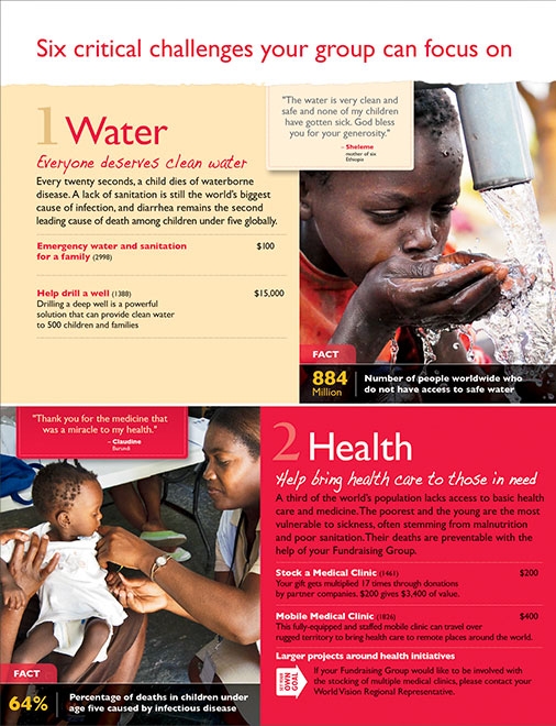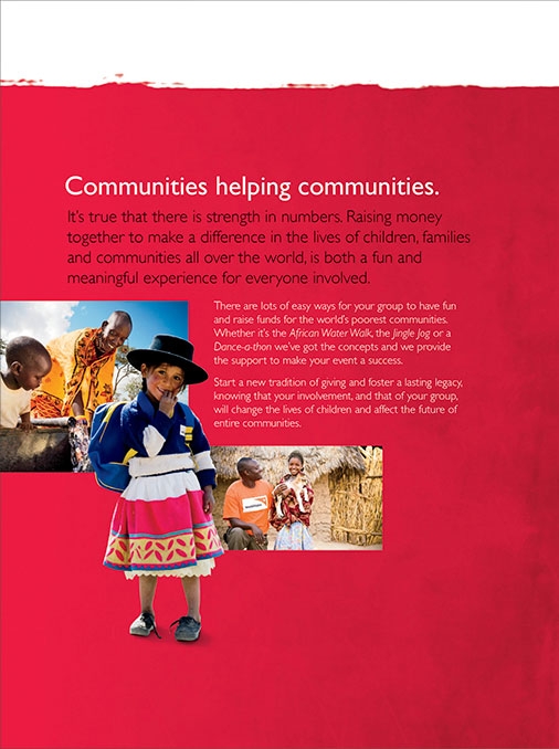 A brochure which promotes the idea of groups holding events—a sponsored walk, say, or a car wash—which would raise money for gifts from the annual World Vision Gift Catalogue. Gifts like goats and chickens, school supplies or mosquito nets for children in some of the most troubled places on earth.